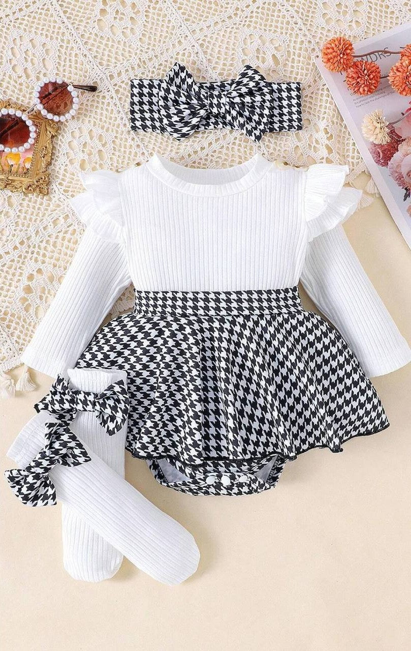 كل طقم مكوّن من 4 قطع: فستان أو بلوزة وتنورة مع إكسسوارات مطابقة مثل ربطة الشعر والجوارب، ليكتمل المظهر بأجمل لمسة.